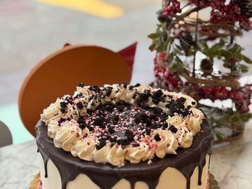 Rich chocolate cake filled with layers of peppermint buttercream and topped with peppermint candy crushed canes. Available whole and by slice
