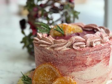 Orange cake made with fresh orange juice and orange zest and lightly sweetened with maple syrup, filled with a cranberry curd. Available whole and by slice