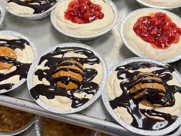 We start with a graham cracker base and then top with a vanilla cream cheese and whipped cream. We top with a variety of toppings, turtle, buckeye, strawberry, cherry, raspberry, chocolate and more. Sold individually in freezer section at shoppe