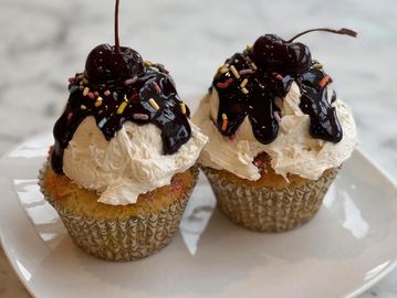 Our confetti cupcakes are topped with a vanilla buttercream frosting, sprinkles and chocolate ganache and cherry. Looks almost too good to eat. They are edible and delicious.