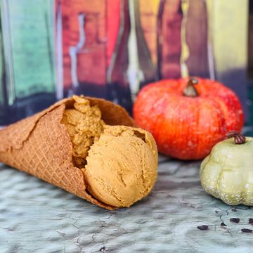 Pumpkin cookie dough mixed in our soft serve that is blended with pumpkin and spices.. This is nut free and delicious.