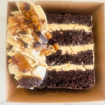Scratch ice crème base cake on brownie or cookie base topped with decadence